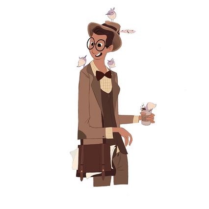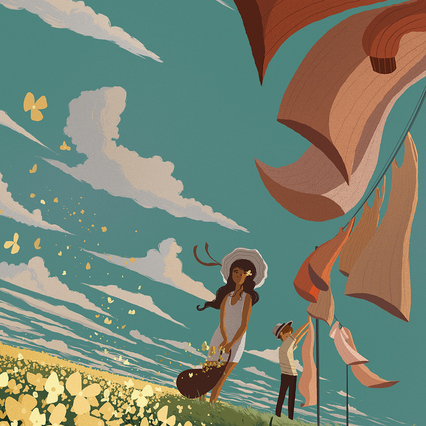 I play a lot with contrasts in my work, something I’ve applied in this scene: the characters are at a standstill, the huge bear with a tender gaze stops at a patch of flowers to smell them, while the young girl looks at her companion with affection. It’s a scene with a simple message: a massive creature with a curious gaze suddenly turns very gentle with the flowers. There’s a balance here between a large, somewhat clumsy subject and an action full of delicacy and lightness. This relationship with nature and the idea of, from time to time, taking a moment to appreciate simple things is what guided me in creating this piece and what informs my process in general.