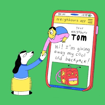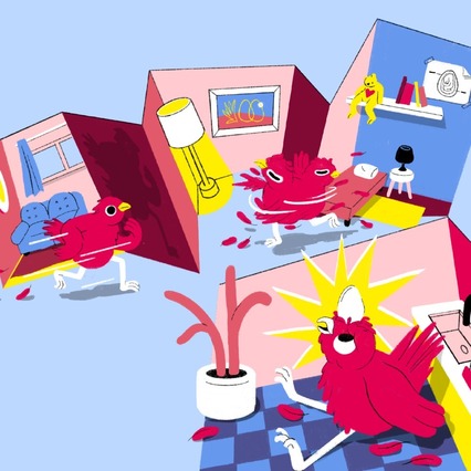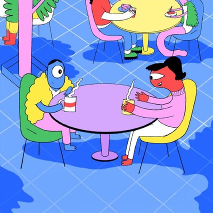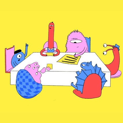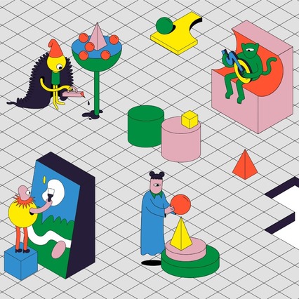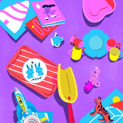 I'd describe my style as very colourful and cheerful, a whimsical world populated by alien-like characters. While most of my work is digital, I also love to swap the screen for carving tools and create linocut prints. I'm drawn to the simplicity and limitations of linocut - having to reduce an image to its most essential shapes is a super satisfying process.