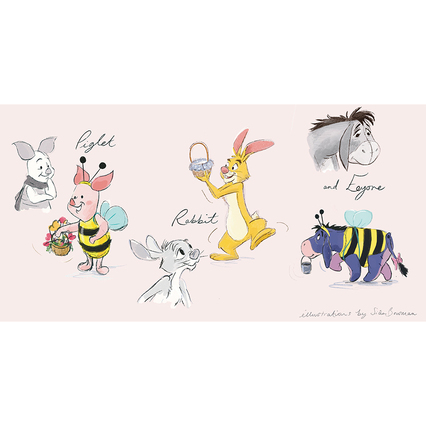 “My love for Pooh bear comes from early memories, listening to the tales by A. A. Milne, watching the Disney films and in recent years sharing all these things again with my children. And seeing the characters fresh through an adult lense, what can seem so simple is ‘just so’ capturing a feeling in words and lines.