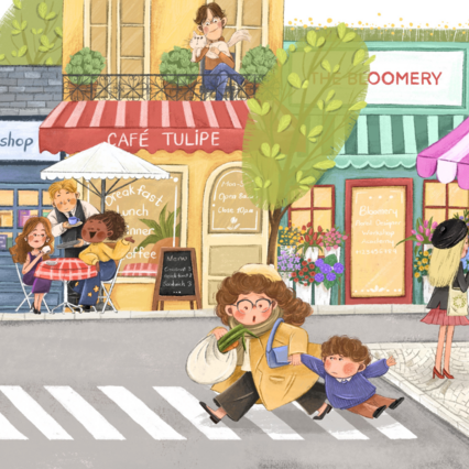 I love illustrations filled with tiny, interesting details—a little bird singing on a tree branch, a black cat hiding behind the curtain, or toys tucked under the sofa. Adding these small elements to a picture brings the story to life and makes the process so joyful for me. I think that’s what makes my illustrations special: the longer you look, the more little surprises you’ll find.
